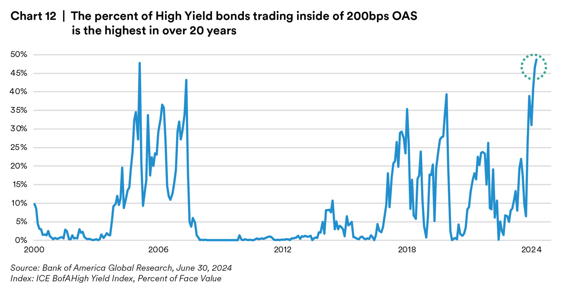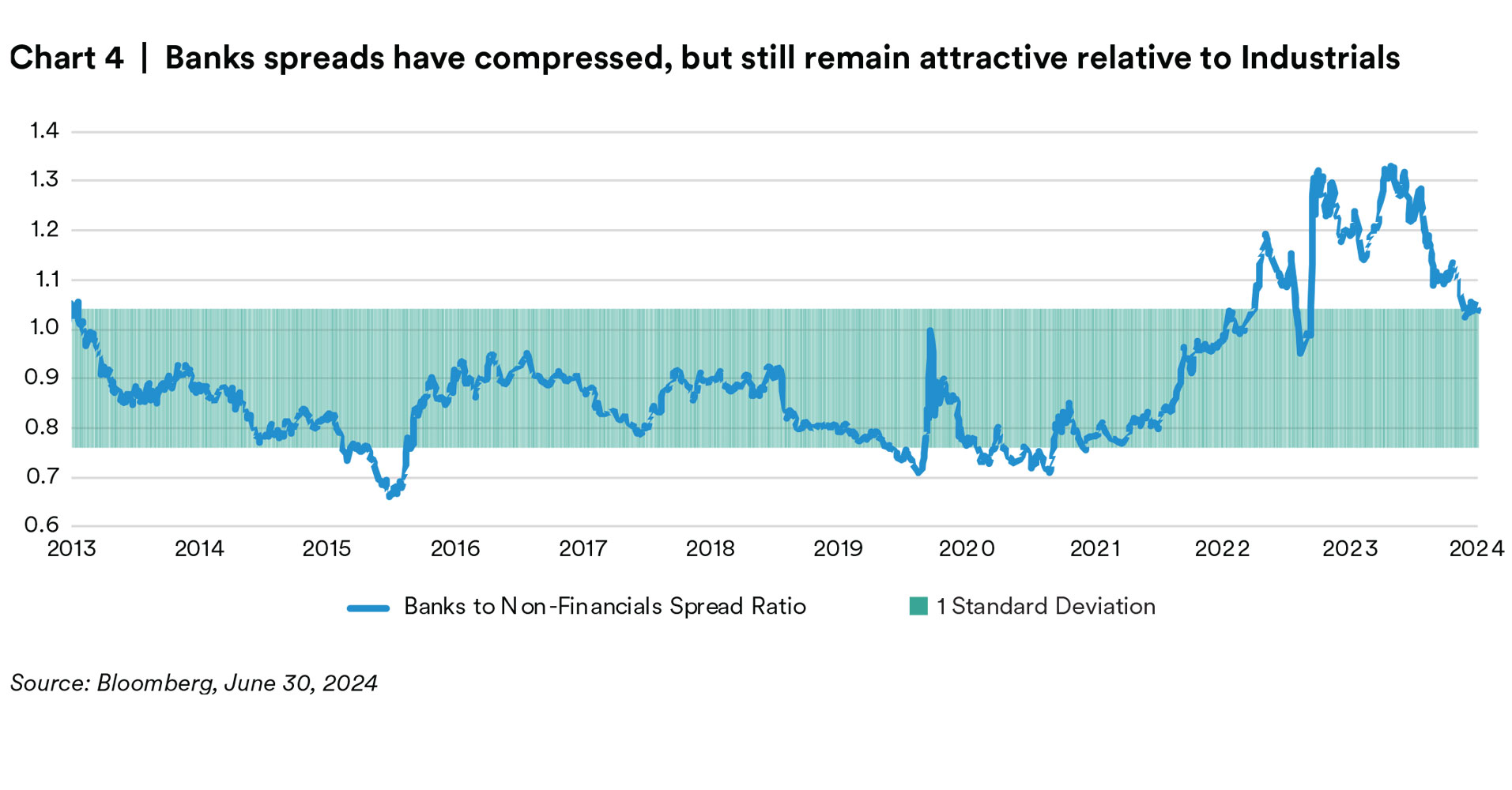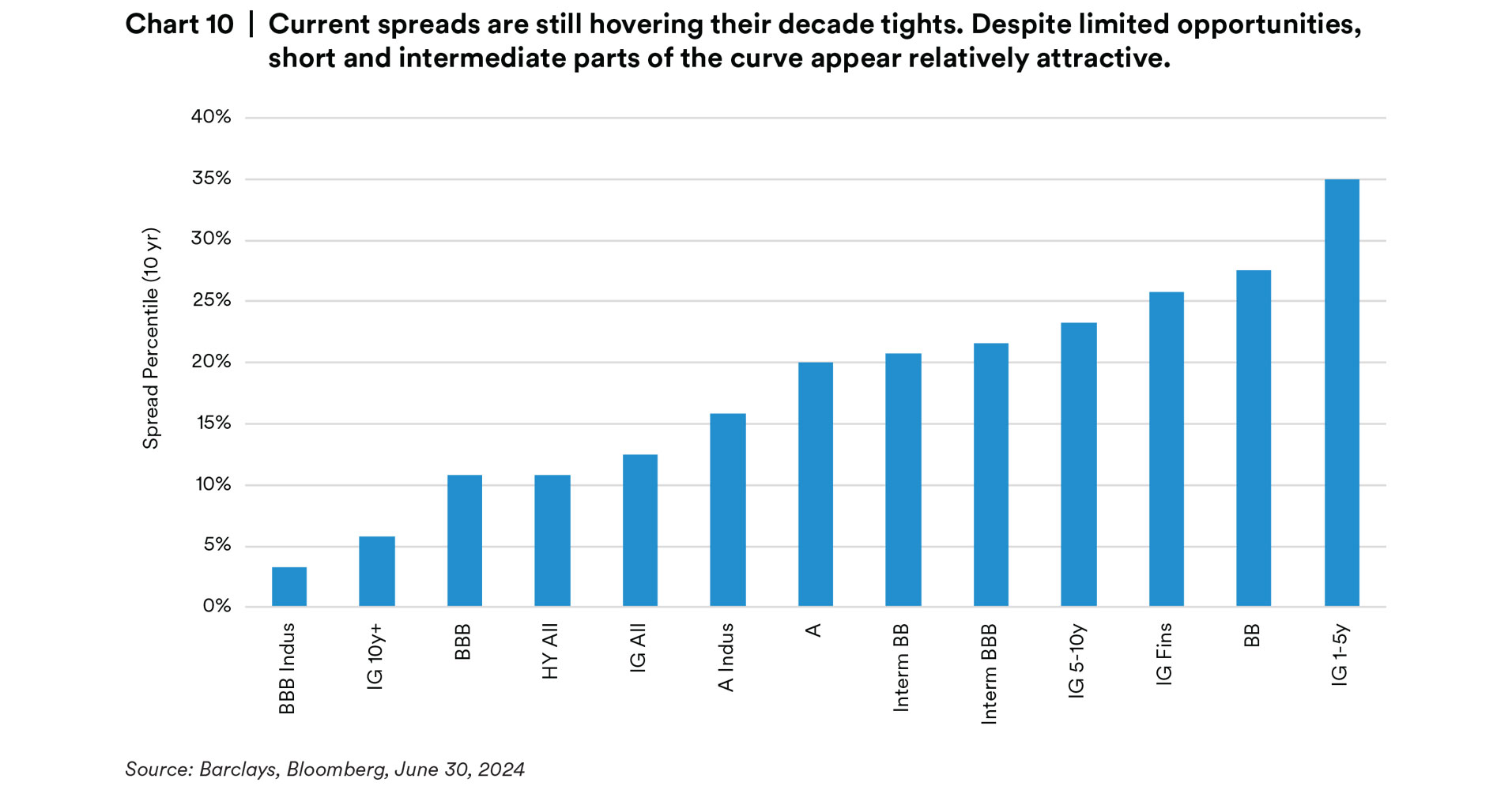 From a sector level, we continue to believe that the Banking sector has room to compress relative to Industrials (despite significant outperformance already this year), whereas within Industrials, we prefer to position for decompression. We believe the outperformance of BBB Industrials may be long in the tooth, and see more value in defensive and less cyclical sectors at this point in the cycle, that in many cases are trading cheap due to elevated issuance. Another area that has our attention is compression amongst liquidity tiers. As less liquid credit is apt to underperform in a sell-off, we are identifying opportunities to upgrade our liquidity at tighter spread relationships. From a curve perspective, we still favor the front end which we believe is a conservative way to build a yield advantage. We also remain comfortable maintaining our underweight to the long end, though we are willing to gradually reduce that significant underweight in select credits that have unjustifiably steep curves. We are less enticed by adding yield via the high yield market, where we believe the spread pick relative to front end corporates to be quite unattractive. Just because interest rates have remained higher for longer than anticipated does not mean things will persist forever. We believe there is general fatigue in the market, from equities to spreads and the economy, that is driving a disregard for a myriad of risks surfacing. We are most acutely focused on how restrictive monetary policy affects the U.S. economy and could spell a fragile environment for credit spreads. This does not even begin to address the bubbling risks of a U.S. election, French politics, further weakness in Europe, a weaker Japanese Yen, mounting geopolitical tensions, a resurgence of regional banking risks or rolling real estate defaults (just to name a few). While the exact catalyst for spread widening remains unknown, we believe there are enough risks globally to warrant a defensive posture in portfolios against a near record tight environment. Market focus on yield instead of spread should continue to provide some security selection opportunities in the near term, but has also set up for materially negative excess return we feel is greatly underappreciated.