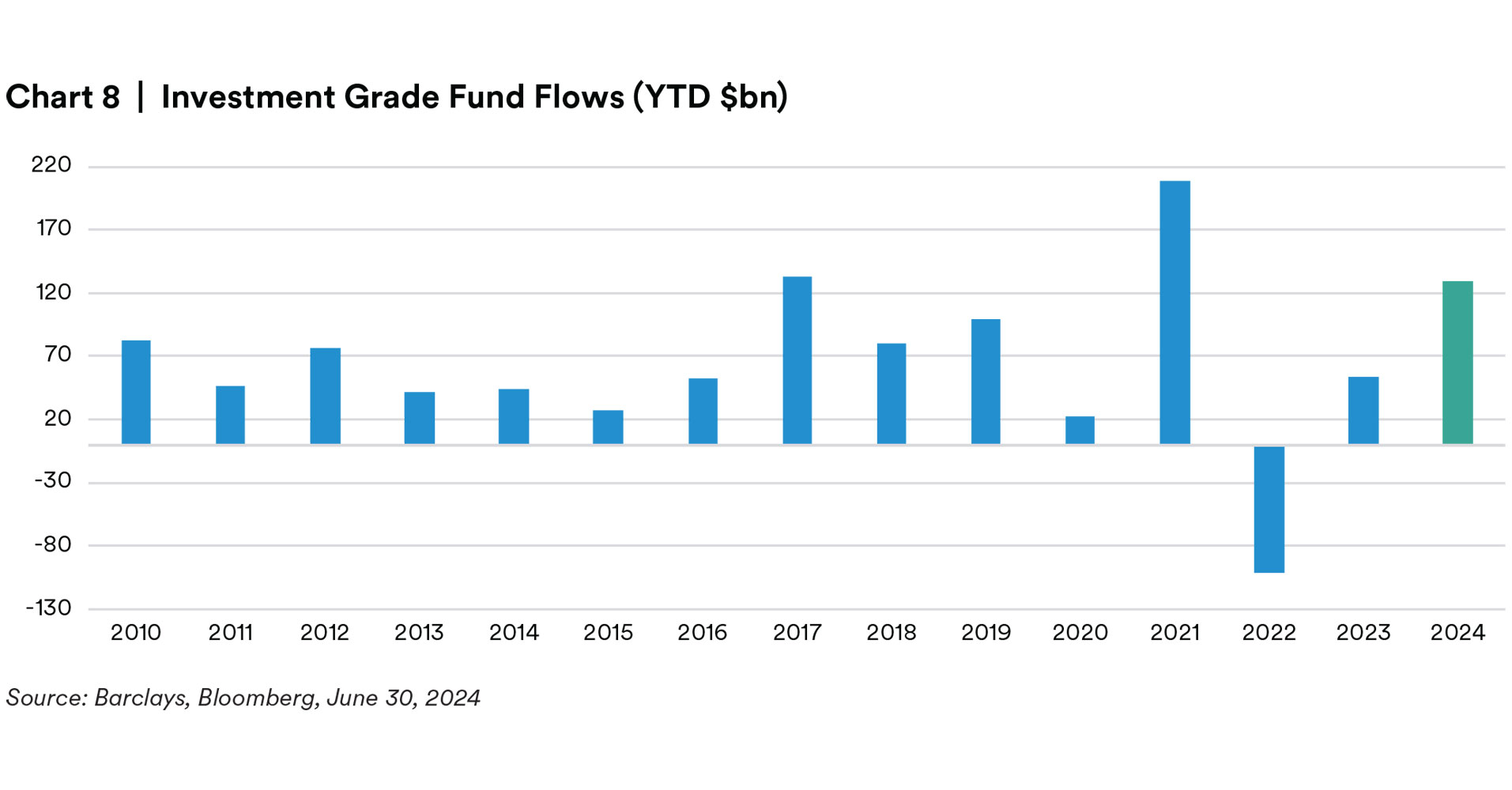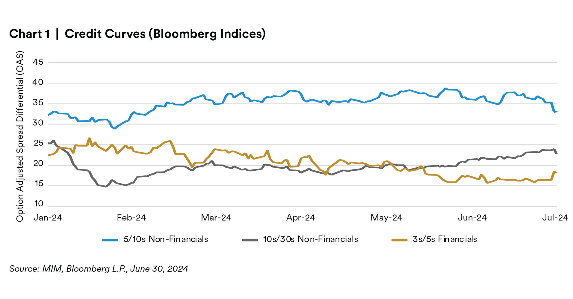 Fixed income markets delivered modest performance in the first half of the year, notwithstanding a volatile April that saw fixed income markets lose up to 2.5% before recovering in May and June.1 A rally in U.S. Treasury yields boosted total returns, although excess returns diverged across credit sectors. In the broadest sense, we witnessed higher quality credits decompress, while lower rated credits saw their spreads tighten relative to their higher-rated peers. Credit spreads, although they sit wider today, tightened to as low as 80 basis points over duration matched treasuries by the end of May, before a soft widening in June, ending the quarter 3 basis points wider. The Agg (Bloomberg U.S. Aggregate Index) recouped some of its year-to-date losses, but still ended the first half of the year 71 basis points lower than its starting value. Riskier fixed income assets, such as high-yield bonds, bank loans, and preferred securities, outpaced investment-grade corporates in the first six months of 2024. Although total returns for the Bloomberg U.S. Credit Index struggled in April due to rising treasury yields, excess returns were still positive. In May, the Credit Index benefited from a tailwind of declining rates, in addition to modest spread compression. However, June’s performance was weaker as spreads were pressured wider predominantly on the back of robust new-issuance combined with a political picture that may include further spending which we believe also pressured back-end rates. We maintain a constructive view on investment-grade corporate bonds, which offer attractive yields and moderate credit risk to institutional investors but remain cautious of late-cycle credit dynamics and consumer data showing signs of weakening.
