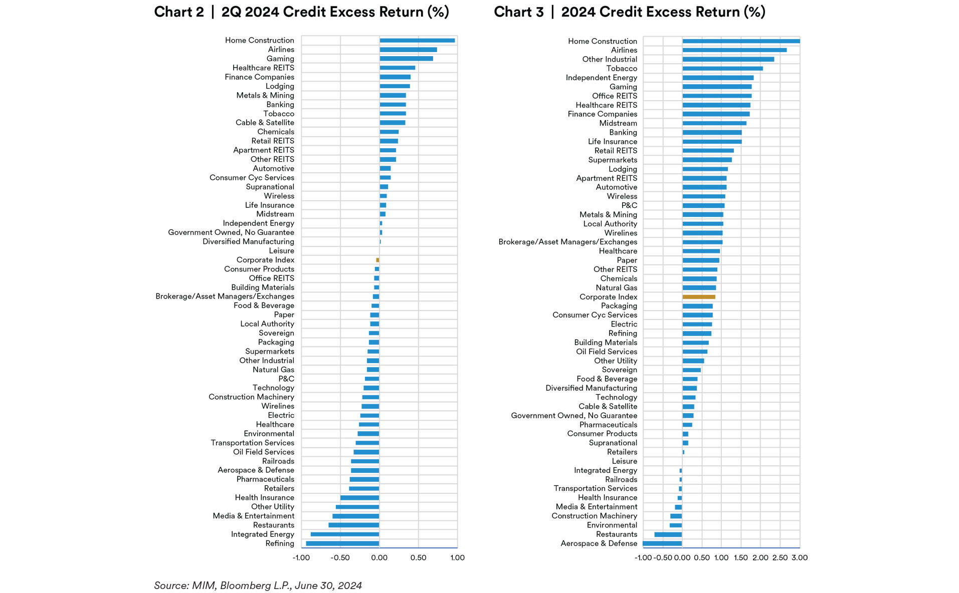 Performance wise, the Corporate index returned 85 basis points above duration matched Treasuries year-to-date despite shedding 4 basis points in excess return over the quarter. The OAS of the index reached a low of 85 basis points in May and decompressed 9 basis points into June before a brief rally to close the quarter. Across ratings cohorts, lower quality (BBB, 0.14% excess) outperformed single A (-0.12% excess) delivering 30 basis points in additional excess return over the higher quality components of the index. At the sector level, leaders were Home Construction (0.92% excess), Gaming (0.72% excess), Healthcare REITS (0.54% excess), Airlines(0.49% excess) and Tobacco (0.41% excess) for which larger contributions came from compression amongst lower rated (BBB) issuers benefiting from investors continuing to chase the all-in yields. Across sectors that lagged, Media and Entertainment issuer, Paramount, struggled following the Redstone family’s abrupt pause to M&A talks with SkyDance. In Restaurants, the sector was pulled lower on weakness from both McDonald’s Corp. as well as Starbucks which faced headwinds related to weaker consumer spending. Conversely, HealthCare REITS reaped strong gains lead by Healthpeak and Omega Healthcare despite weaker sentiment in commercial real estate overall. Airlines were also a stronger sector supported by robust bookings and expectations for a strong summer travel season. However, the top performing sectors in excess returns were the results of a catch-up in beta compression of low BBBs in smaller sectors that lagged earlier in the year.3
