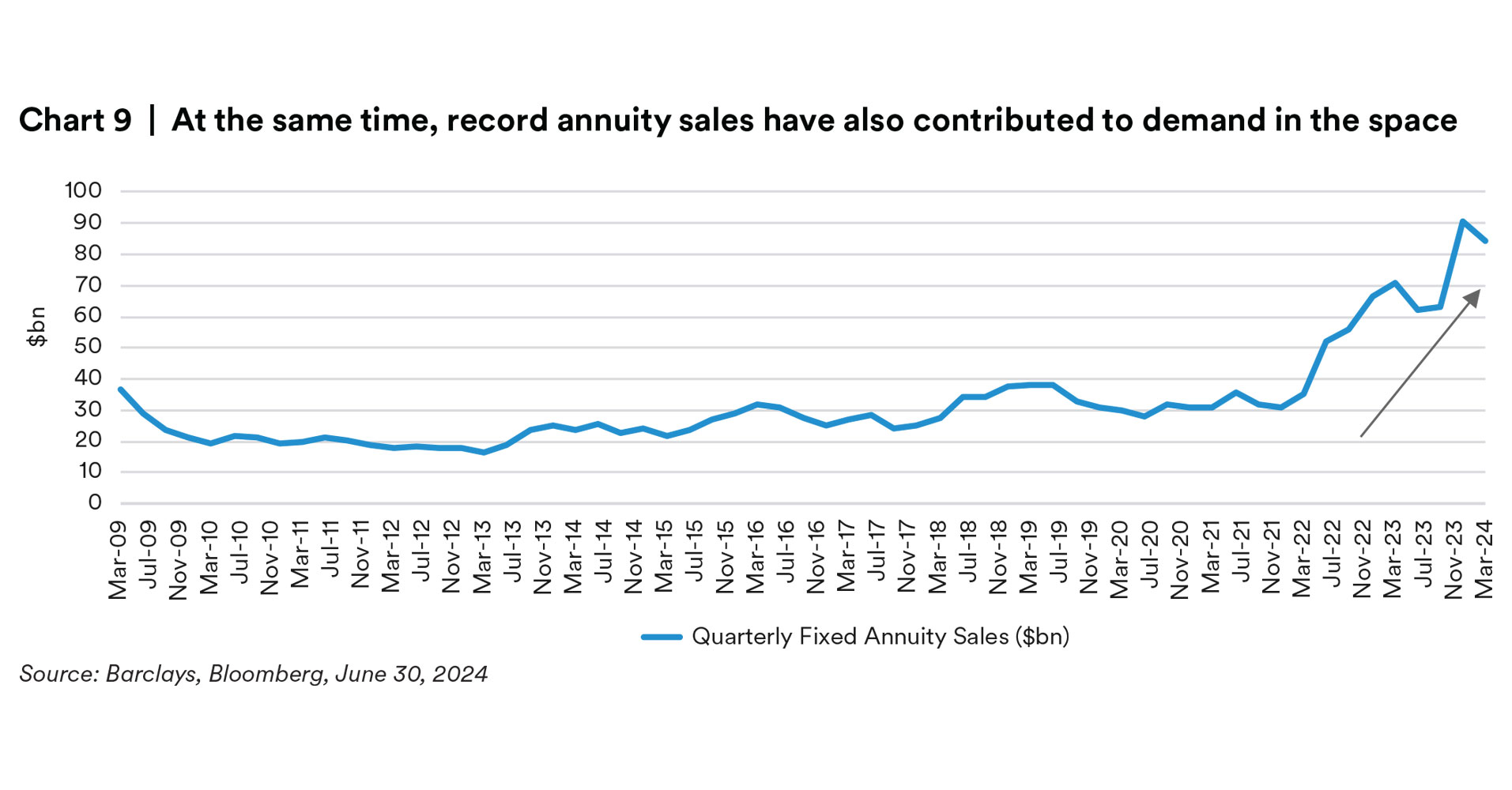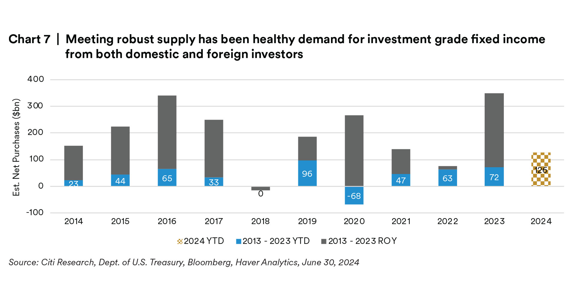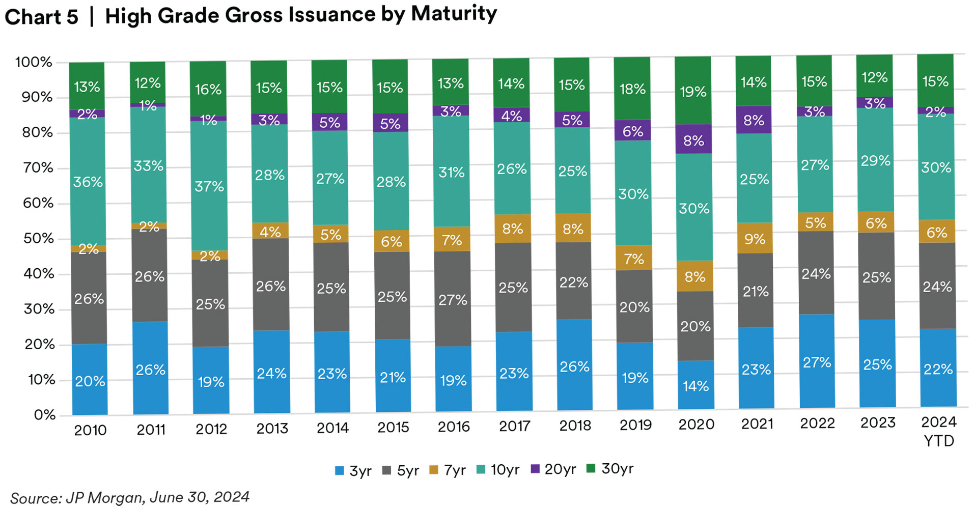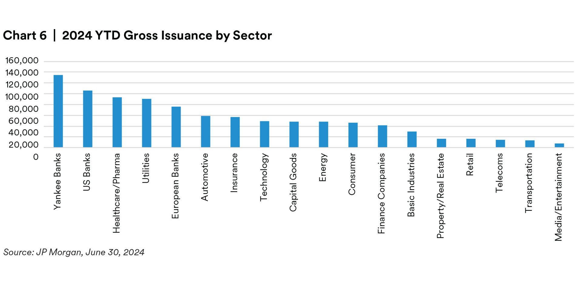 U.S. Corporate issuance over the first half of 2024 recorded the second highest amount of issuance on record just behind that of the first half of 2020. In our view, the $874 billion of high grade issuance represented issuer’s decisions to bring forward planned issuance for the year ahead of any volatile that could be introduced as the U.S. moves closer to elections as much as taking advantage of a relatively attractive funding environment where the demand for fixed income remains steadfast alongside narrow credit spreads in an issuer’s favor. Following the first quarter, Banks tapped markets for funding in April which trailed off throughout the quarter. In May and June, it was Industrials that issued the bulk of supply to help support general financing as well as M&A deals in the marketplace. Across the marketplace, some of the larger deals came from Boeing and Home-Depot both bringing $10bn respectively across the curve, CVS and Johnson & Johnson issuing $5bn and $4bn, respectively in May, and then Energy Transfer raising $3.5bn in June. Across capital structures, there was an uptick in issuance of hybrid capital structures as the senior-subordinated differentials compressed, which could be attributed as well to a methodology change from Moody’s regarding equity credit for junior dated subordinated debentures. By maturity, back-end supply has picked up in a big way with long-dated supply up 26% versus this same time last year. The average maturity of newly issued bonds in 2Q24 stood at 10.5yrs compared to 10.8yrs in 2Q23 and 10yrs in 2Q22.4