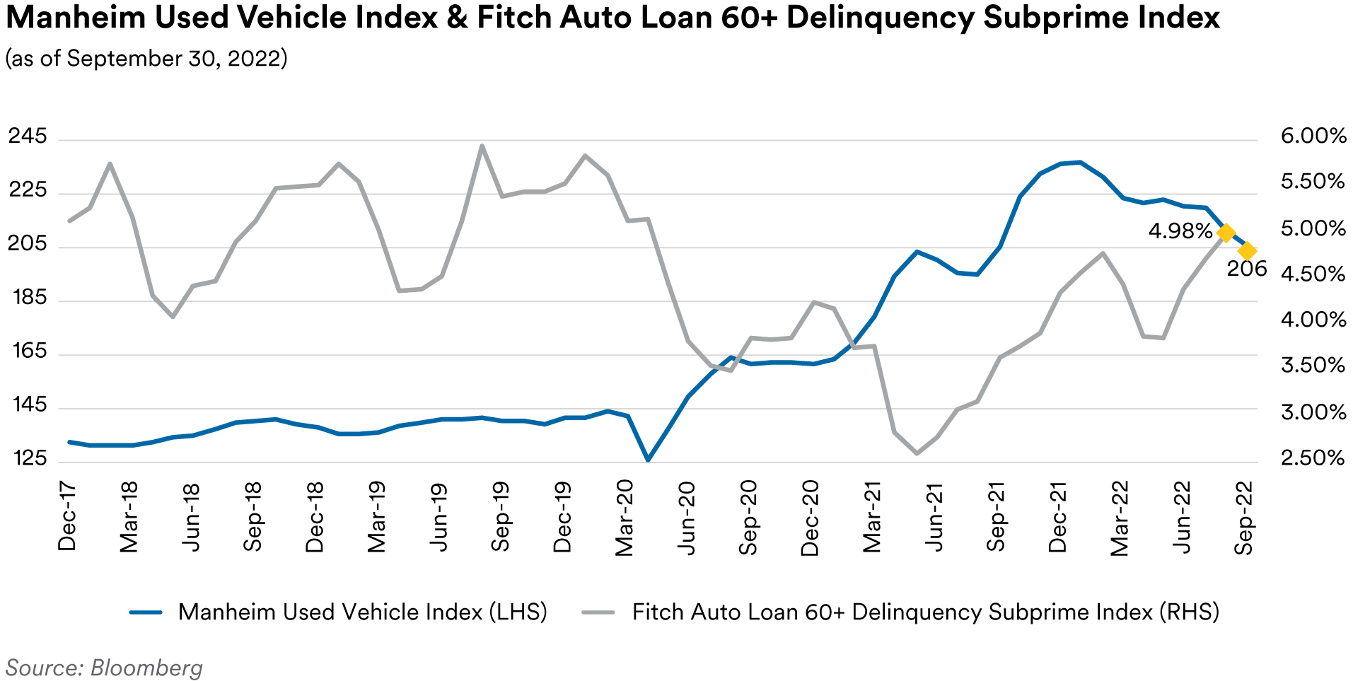 Declining used car prices, together with the headwinds from rising inflation and higher interest rates have begun to pressure auto ABS performance. As of August’s, data, the 60+-day delinquency rates on the Fitch Auto ABS indices were 0.22% for the prime index and 4.98% for the subprime index, numbers which reflect increases of 7 basis points and 182 basis points, respectively, from last year’s levels. Similarly, annualized net loss rates for the indices stand at 0.18% for the prime index and 6.35% for the subprime index, 5 basis points, and 330 basis points higher, year-over-year, respectively. In our view, the marked divergence between the prime and subprime metrics illustrates the fact that prime borrowers are much better positioned to whether deteriorating economic conditions than subprime borrowers. As we have noted in prior commentaries, despite this expected downturn in performance, we are comfortable with our holdings in AAA and AA-rated auto tranches as we believe these deals have ample credit enhancement to protect bondholders.