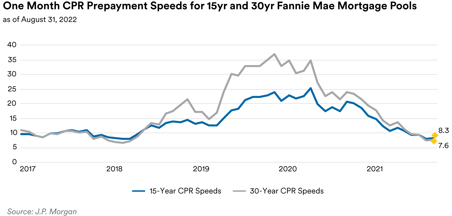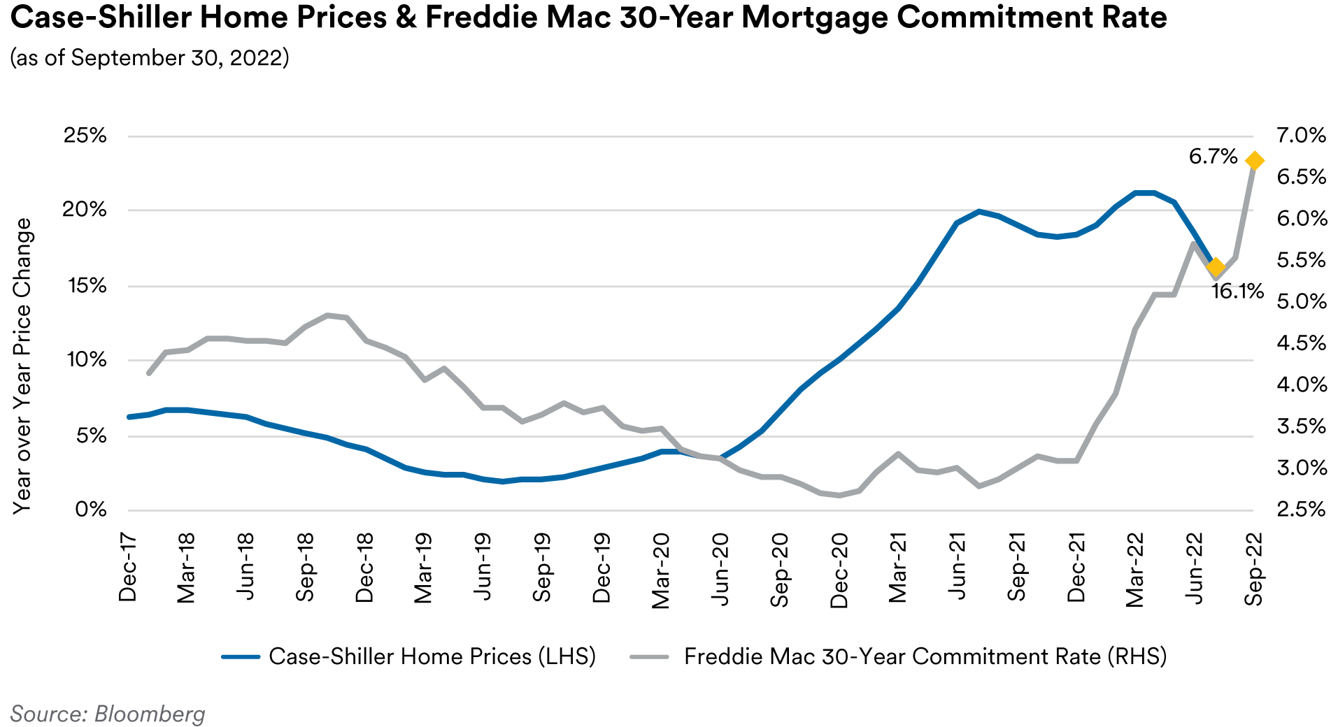 Mortgage rates continued to move higher over the third quarter as the Fed raised rates. The Freddie Mac 30-year mortgage commitment rate rose 100 basis points over the quarter to 6.70%, the highest level seen since July 2007. With current rates driving most mortgages out of the refinancing window, prepayments have dropped close to base “turnover” levels.1 October’s prepayment report showed speeds on Fannie Mae 30-year mortgages paying 6.8 CPR in September, a decline of 13% compared to August’s 7.8 CPR print, which was flat to July’s level, following a drop from 9.3 CPR in June. Fannie 15-year speeds came in at 7.4 CPR, down 12% compared to 8.4 CPR in August, a 2% uptick relative to the 8.2 CPR seen in July but still lower than June’s 9.4 CPR print.1 With interest rates now at levels not seen since 2007 and winter seasonal factors coming into play, we expect prepayment levels to drift even lower over the next several months. As rising mortgage rates created challenges for buyers, home price growth decelerated over the quarter. The September release of the S&P CoreLogic Case-Shiller 20-City Home Price Index showed home prices fell month-over-month in July, the first monthly decline in prices in a decade. On an annualized basis, the report showed home prices rose at a 16.1% pace through July, behind economists’ projections and the third consecutive month of lower annualized gains. The Sunbelt metros continued to show the highest growth with Tampa (+31.8%), Miami (+31.7%), Dallas (+24.7%), Charlotte (+23.6%), Atlanta (+22.8%), Phoenix (+22.4%), Las Vegas (+21.8%) and San Diego (+16.6%) showing the fastest growth. In contrast, Minneapolis (+9.0%), Washington DC (+9.4%) and San Francisco (+10.8%) showed the slowest price growth. On a national level, Case-Shiller’s data showed home prices rising at a 15.8% annualized pace in July. However, when compared to the 18.1% pace seen in June, July’s print represents the largest month-to-month deceleration in the history of the index.