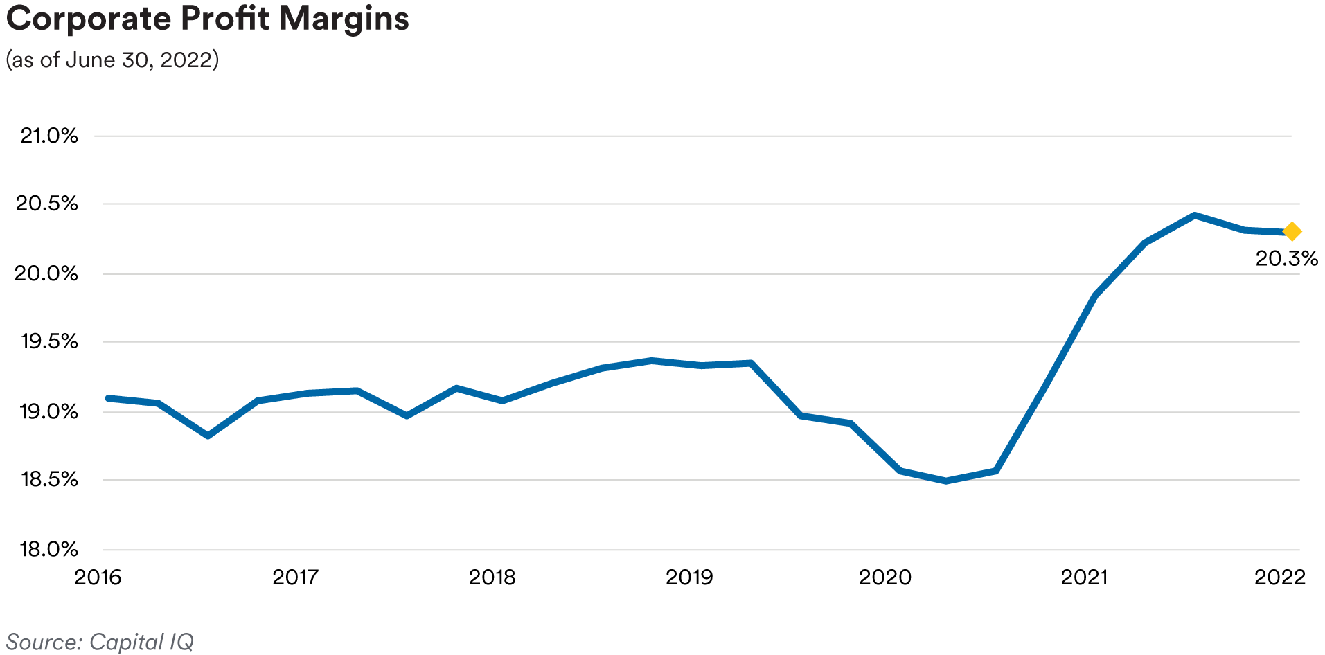 Turning to corporate credit fundamentals, we saw more evidence of stress on corporate profit margins and earnings throughout the third quarter as issuers reported second-quarter earnings growth at the slowest pace since fourth-quarter 2020 with many lowering guidance prior to printing results (72 companies in the S&P 500 Index).1 Although many issuers successfully passed along higher costs by raising prices, a large number continued to experience supply chain-driven cost pressures and increased labor expense while being unable to fully protect their operating margins. FactSet’s consensus expectation for upcoming third-quarter bottom-up earnings for the S&P 500 index’s constituents has been reduced at the fastest pace since second-quarter 2020, when the pandemic took hold, and is currently 2.9%. With earnings growth rapidly decelerating, on the positive side aggregate debt leverage has continued to creep lower with no signs that the consumer-driven U.S. economy is falling out of bed. Additionally, retail sales indicators have not been strong but consumer confidence measures have been trending higher off the summer’s lows, undoubtedly helped by the easing of gas prices and weaker month-over-month headline inflation readings for July and August. We remain on the lookout for signs of softening in the labor market or the potential for consumer spending to turn lower as the Federal Reserve sticks to its hawkish monetary policy tightening script.