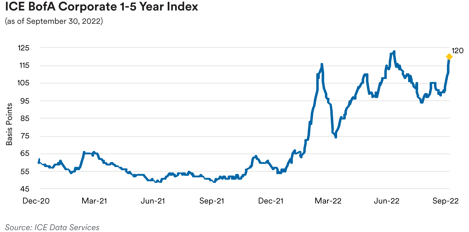Portfolio Actions & Outlook: The ICE BofA 1-5 Year U.S. Corporate Index, our bellwether front-end investment grade corporate index, closed out the third quarter at an option-adjusted spread (OAS) of 120 basis points, 1 basis point tighter than where the index began the quarter. That small change masked some of the extreme market moves and episodes of volatility that shook investors as it relates to tighter monetary policy confidence over the quarter. Although corporate credit fundamentals across most corporate subsectors remain on a decent footing, based on our belief that risks are tilted in favor of the global economy slowing more decidedly in the quarters ahead, coupled with central banks unwilling to collectively take their foot off the gas to avert a hard landing, we reduced our risk positioning in investment grade credit across strategies in the third quarter as we believe credit spreads are poised to move wider. This was accomplished most decidedly in our longer 1-3 year and 1-5 year strategy portfolios, where the negative impact of spread widening is higher. Even in our shortest dated strategy portfolios, consistent with our selling in the longer strategies, we trimmed investment grade credit sector weightings and spread durations. This was effected by reducing exposure to some of our less favored, more cyclically-exposed subsectors and more non-U.S.-exposed holdings, including Yankees.