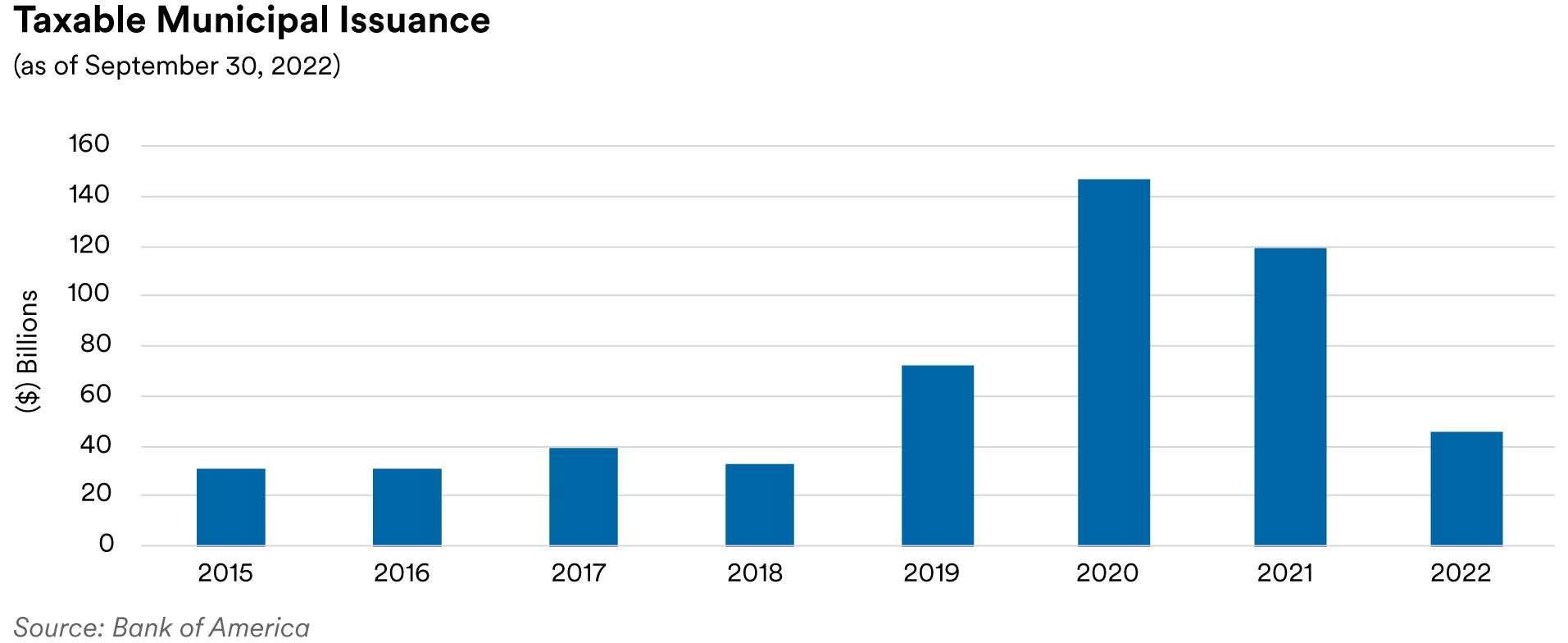 Recap: Total municipal new issue supply was $93.5 billion during the third quarter, a 26% decline from last year’s third quarter. The inability of issuers to advance refund their tax-exempt debt coupled with a higher interest rate environment were the catalysts for muted primary market activity with total refundings 65% lower compared to that of 2021’s third quarter. Overall, taxable municipals had negative absolute and excess returns during the third quarter. For the quarter, the ICE BofA 1-5 Year U.S. Taxable Municipal Securities Index total return was -2.66% versus the ICE BofA 1-5 Year U.S. Treasury Index total return of -2.28%. Taxable municipal underperformance was a result of spread widening as investor sentiment shifted on the heels of higher volatility and rising interest rates. Fund outflows were prevalent over the third quarter as market participants digested the everchanging macro landscape.