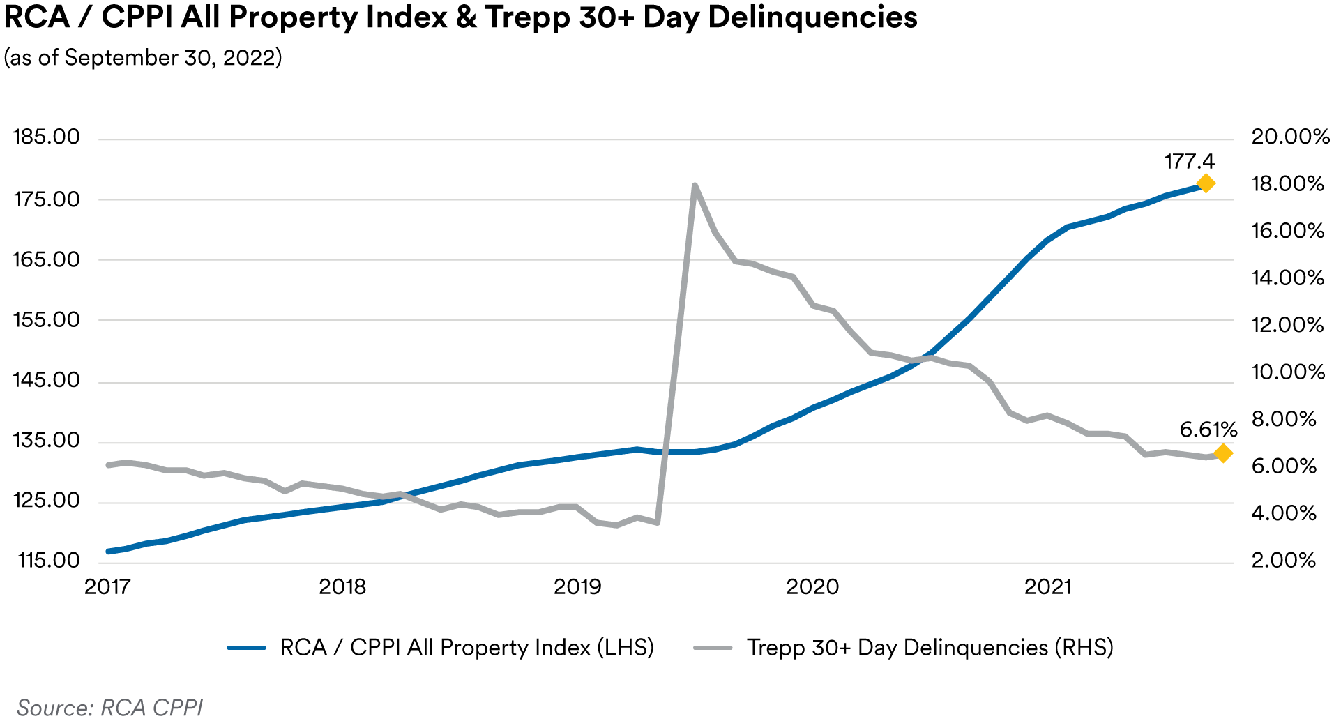 Despite rising interest rates, inflation and macro volatility, CMBS delinquencies fell over the course of the quarter. As measured by the Trepp 30+-day delinquency rate, CMBS delinquencies ended September at 2.92%, a decline of 28 basis points for the quarter and 165 basis points for the year. The delinquency rate has now fallen for 25 of the last 27 months since reaching the Covid-19 high of 10.32% in June 2020 (the all-time high on the rate was 10.34% seen in July 2012). Lodging properties saw the largest improvement in delinquencies, falling 92 basis points to 5.02% as business and vacation travel continued to rebound from pandemic lows. On a year-over-year basis, lodging delinquencies have now fallen 643 basis points and have passed the dubious crown of worst-performing subsector to retail properties. Retail delinquencies ended the quarter at 6.61%, down 8 basis points for the quarter and 314 basis points year-over-year. Industrial properties remain the top performer with delinquencies in that subsector dropping 6 basis points over the quarter to 0.43%. On a year-over-year basis, industrial property delinquencies have declined 16 basis points.1