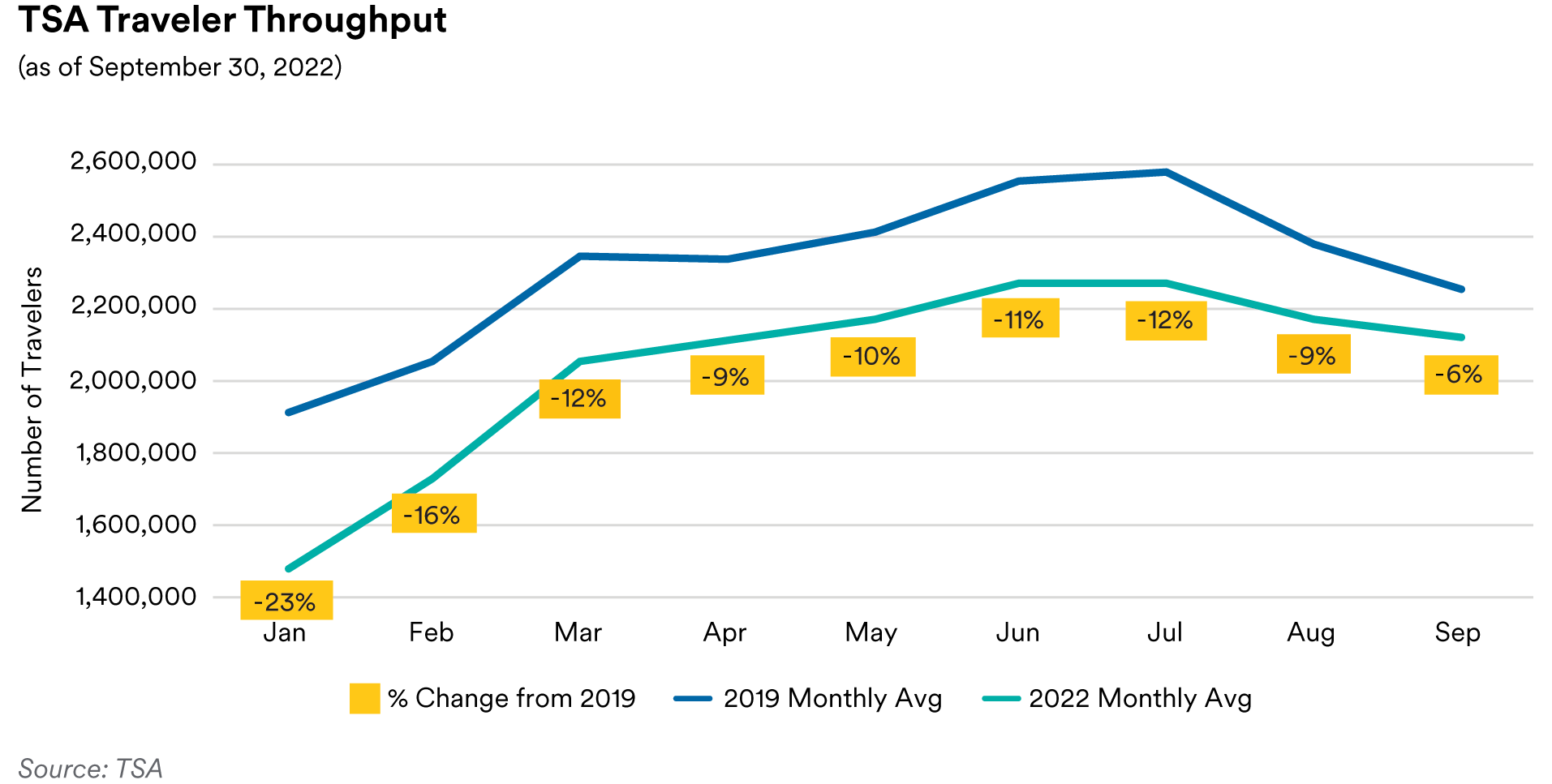 Portfolio Actions & Outlook: Our allocation to Taxable Municipals was maintained in our shorter duration strategies while we increased our weighting in our longer duration portfolios. Purchases in the portfolios continue to be defensively driven and were concentrated in higher-quality securities. We focused on state general obligation or tax-backed debt as well as transportation-related credits. Any reductions in our allocation were not related to credit concerns but based on relative value opportunities in other spread sectors; sales were primarily in securities with durations of under one year. We remain constructive in our outlook for state general obligation and related tax-backed debt. Even as we continue to experience positive ratings momentum, volatility in investment returns has increased pressure on pension funding levels. Milliman’s Public Pension Funding Index, comprised of the 100 largest U.S. public pension plans, decreased to 75.0% in August from 77.3% in July. Ongoing inflation and wage pressures, coupled with the potential for revenue growth moderation are likely to result in less budgetary flexibility, however estimated total fund balances of 25% at FYE 2022 should help mitigate the impact of these rising costs. Over the quarter we added to our holdings in the transportation sectors as travel demand, including from business and cruise-related passengers, continued to improve. On average for the third quarter, TSA throughput was only down 9% compared to 2019 levels. Despite increased oil and gas prices, traffic volumes have increased on year-to-date basis (through July) over each of the past few years. Data provided by the Federal Highway Administration shows 1.9 billion Vehicle Miles Traveled (VMT) as of July 2022, an overall increase of 0.3 billion VMT since July 2020.