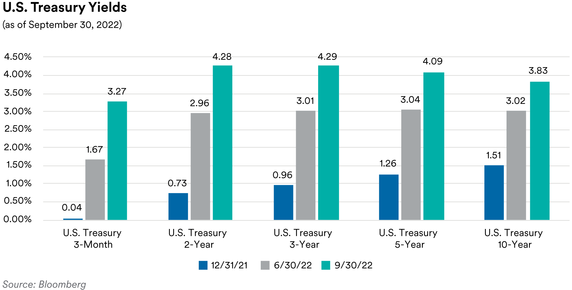 The very front end of the market led the sell-off in the third quarter as short rates responded to the promise of more rate hikes to come. Three-month, six-month and one-year Treasury bill yields were 162 basis points, 145 basis points and 119 basis points higher during the quarter, respectively.