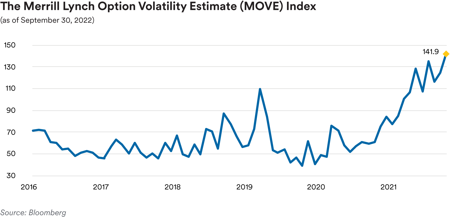The third quarter of the year was defined by continued inflation concerns in the Treasury market as rates across the curve moved through the prior cycle’s highs with front-end yields peaking north of 4.40%. Chair Powell once again raised his hawkishness with a dot plot showing a terminal rate at 4.6% and laid the groundwork for another 75 basis point hike in November. The continued repricing of Fed expectations in the front end of the rates market also resulted in continued elevated volatility, which hit its highest levels since the Global Financial Crisis (GFC). Daily basis point moves being priced into the front end of the Treasury market moved to over 11 basis points a day near the end of the quarter, more than twice what we saw at the start of the year. The Merrill Lynch Option Volatility Estimate (MOVE) Index, which is a yield curve-weighted index of the normalized implied volatility on Treasury options across the maturity spectrum, continued to spike higher in the third quarter to levels last seen in the summer of 2009.