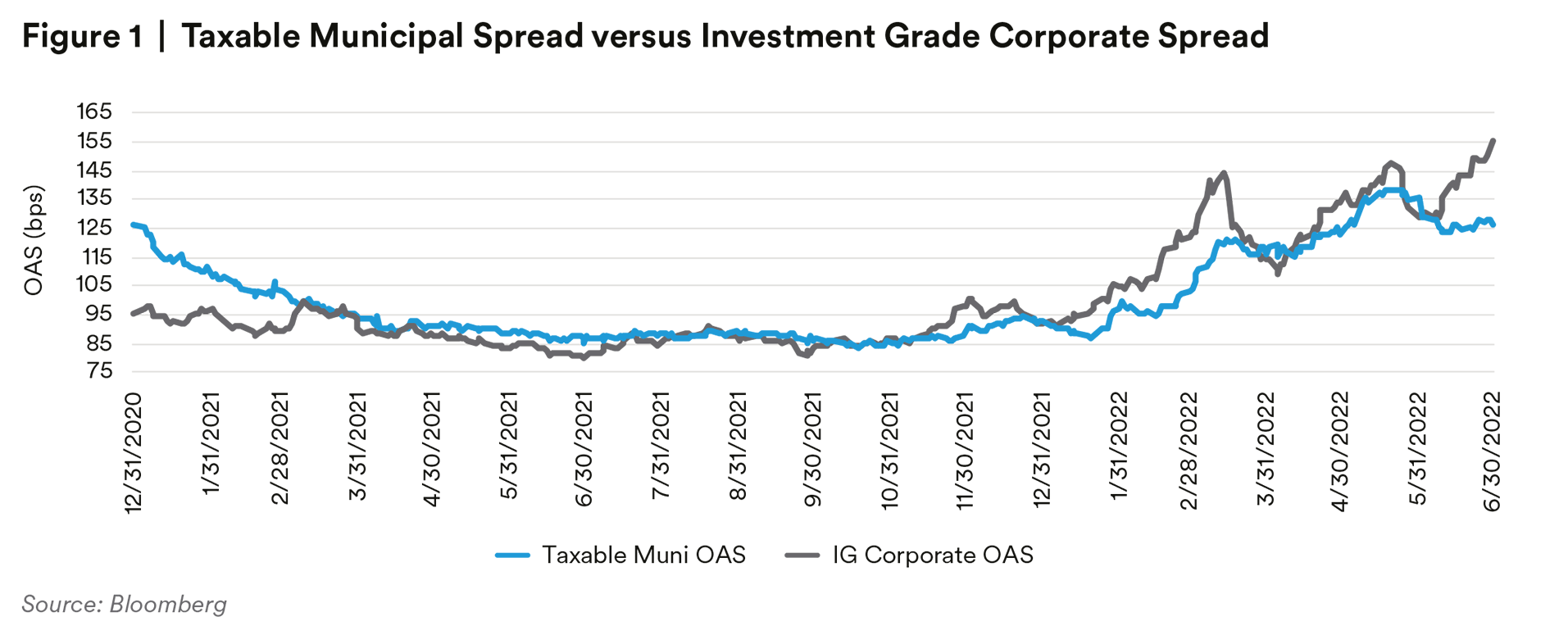 - Consistent with historical observations, Taxable Municipal spreads outperformed Investment Grade Corporates in a volatile “risk off” period. As the market narrative shifted toward the increasing probability of a recession engineered by aggressive policy tightening, the OAS on the Investment Grade Corporate Index surged from a low of 109 basis points on April 5th to 149 basis points on May 20th – a 40 basis point move in just a few weeks. Over the same time period, the spread widening in Taxable Municipals was notably less severe, at 28 basis points.2