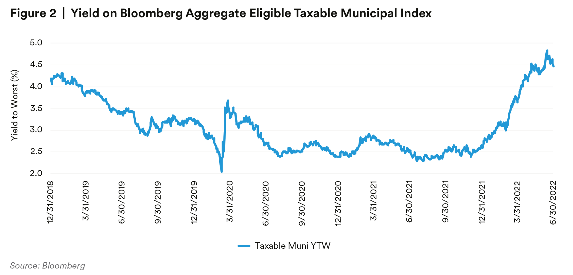 One challenge for investors looking to participate in the Taxable Municipal market has been the sharp decline in new issuance compared to 2021. Year-to-date issuance of Taxable Municipals through June 30th totals $40.8 billion (including bonds issued by municipal issuers with corporate CUSIPs) – a 36% decline year-over-year.4 The primary culprit for the decline in issuance is higher rates, which undermine the economics of refunding transactions that had been a significant source of taxable new issue supply since tax-exempt advanced refundings were eliminated in 2018.