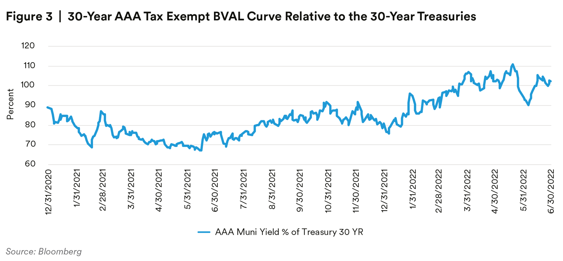 With more limited Taxable Municipal supply, a U.S. investor would be well served to keep an eye on the tax-exempt market. This overwhelmingly retail market offered little value for institutional investors in 2021, with abysmal yields and valuations at historical tights. However, the sharp rise in rates has led to record outflows from tax-exempt funds, which in turn has forced a severe adjustment in valuations. At times in the second quarter, tax-exempt yields became so dislocated that they appeared very compelling even to corporate taxpayers subject to much lower tax rates. A measure of relative value that we follow closely, the ratio of the 30-year AAA tax-exempt curve to 30-year U.S. Treasuries, surged from 81% at the beginning of the year to 111% in May. This ratio hit a low of 67% in 2021.5 At these times of dislocation when ratios spike to well over 100%, certain tax-exempt securities can offer (and have offered) a substantial yield pickup of 100 basis points or more on a taxable-equivalent basis relative to taxable municipal bonds from the same issuer. In these circumstances, we believe that allocations to tax-exempts can be highly advantageous in institutional portfolios subject to corporate tax rates.