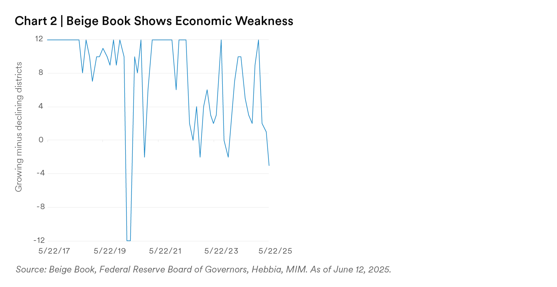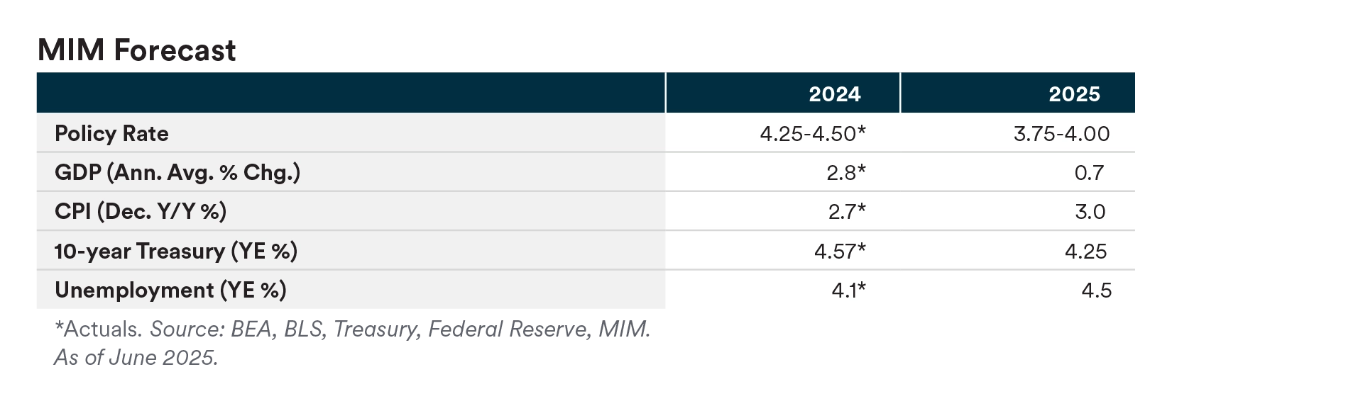 Chair Powell, in his recent remarks, repeatedly articulated his satisfaction with the current monetary policy stance. We expect the Fed to resist cutting until there is greater clarity on the ultimate effect of tariffs on prices. In the second half of the year – if tariff policy settles down by then – we expect labor market dynamics to rise in importance and the FOMC to make substantial cuts to the Fed Funds rate.