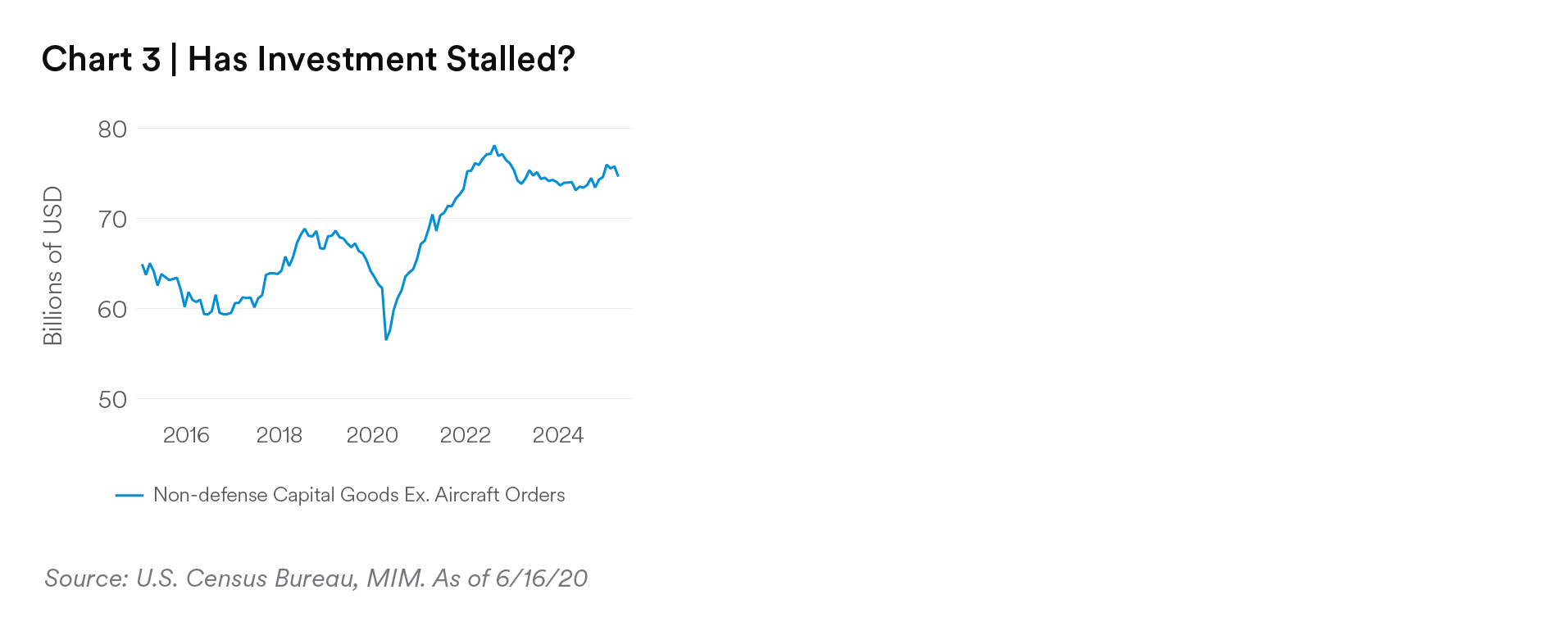 We expect May and June capital goods orders to be similarly underwhelming. However, if the Trump administration can execute, then we should see investment pick up or at least begin to stabilize by the second half of the year, given the self-imposed July 8 deadline for tariff negotiations. If the July 8 deadline is extended or few countries actually reach agreements in the remaining weeks (i.e., uncertainty remains high), then we can expect mediocre investment growth to continue into Q3.